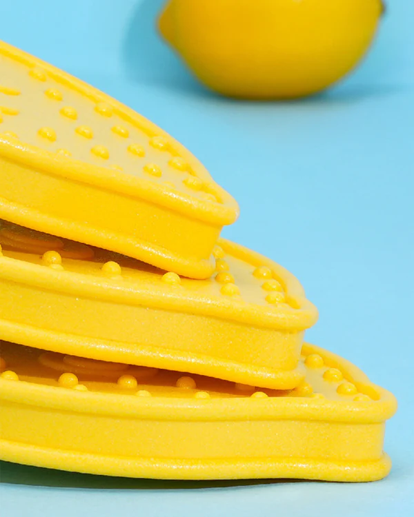 Com formato de uma rodela de limão, este disco grossinho possui um material com brilho sutil que chama atenção sob a luz, dando um toque especial à brincadeira. Suas bordas são salientes e o corpo apresenta pequenas protuberâncias semiesféricas, criando uma superfície fácil de agarrar com patas e bocas – ideal para jogos de busca e mastigação.