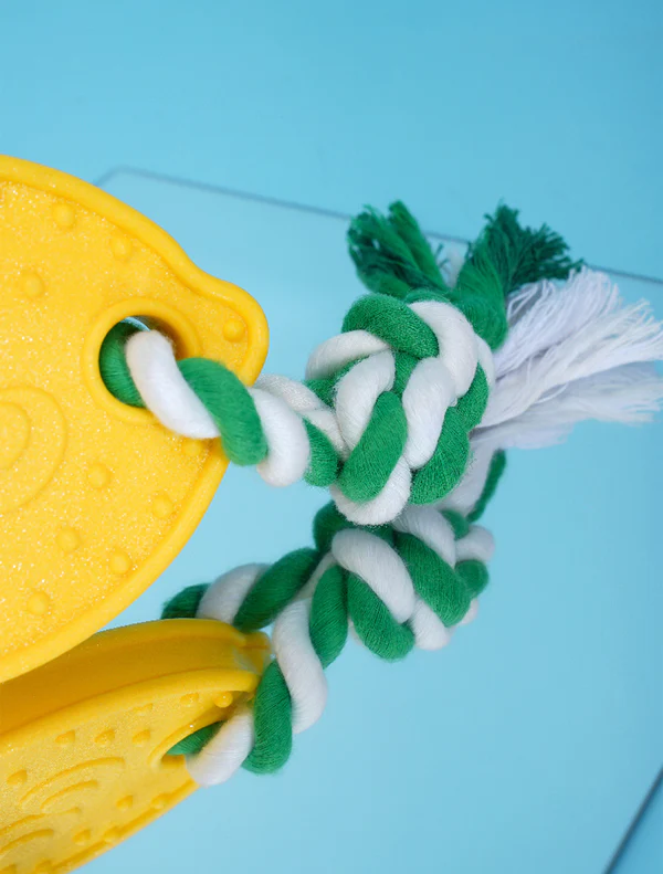 Como extra de diversão, o brinquedo conta com uma corda trançada extra grossa nas cores branco e verde, que atravessa a parte superior do disco e finaliza com um nó resistente – perfeito para puxar, morder e segurar durante as brincadeiras.