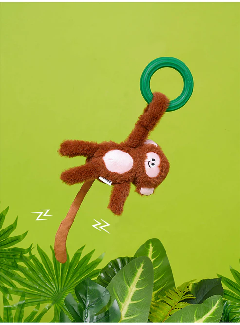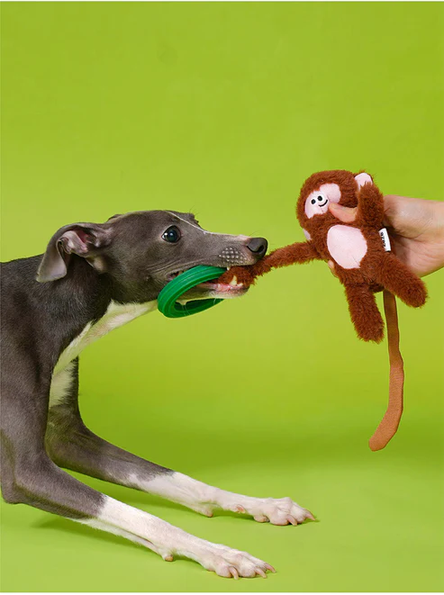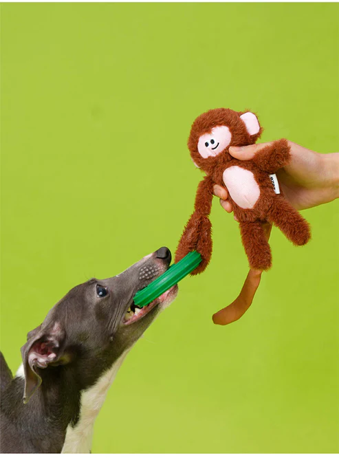 O macaquinho é irresistivelmente fofinho e possui um rostinho delicadamente bordado com expressão alegre, que conquista a todos. Seu corpo é macio e fácil de agarrar, perfeito para abraços e mordidinhas gentis. As orelhas, a barriga e o rostinho são feitos de um material texturizado e suave, que oferece uma experiência sensorial única para seu cachorro.