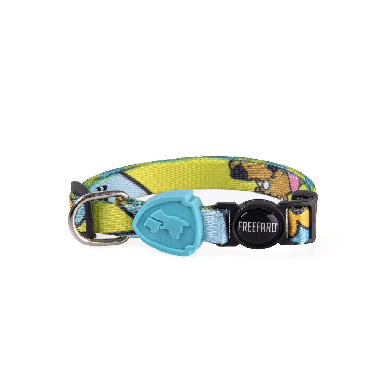 Inspirada em um dos desenhos mais famosos da história, a coleção FreeFaro Scooby-Doo™é uma parceria FreeFaro & Warner Bros que traz referência direta e carinhosa aos fãs da franquia. Possui uma estampa dupla face, de um lado, temos o destaque para as faces divertidas do cachorro medroso e investigador, elementos da Van Máquina do Mistério, a Mystery Machineda animação, logo original e seus amigos — Salsicha, Velma, Fred e Daphne. Do outro a fita é composta por listras verde e azul, além de logos randômicos espalhados por toda a estampa.