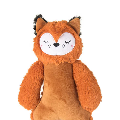 Texturas Variadas para Estimular os Sentidos: O brinquedo combina diferentes materiais para uma experiência sensorial rica. A frente do corpo, o interior das orelhas e o rosto são feitos de um material macio e aveludado na cor laranja queimado, enquanto o resto do corpo, cabeça e orelhas são revestidos com um peluche felpudo e aconchegante.