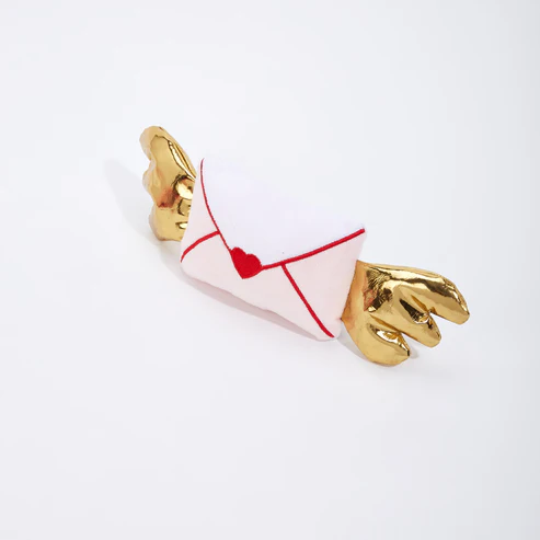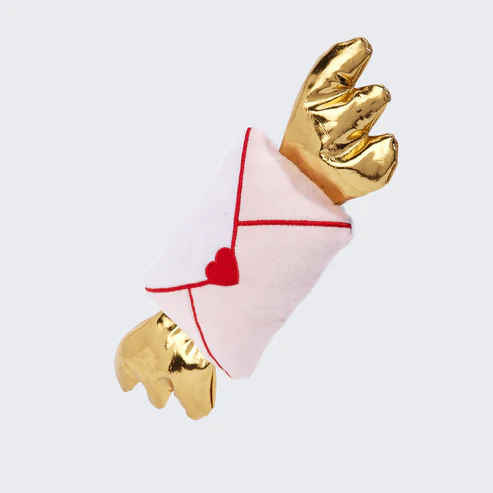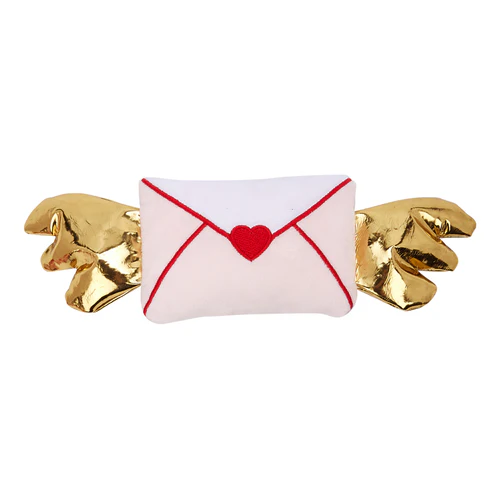 Este brinquedo único em forma de carta é confeccionado nas delicadas cores branco e rosa, com detalhes costurados em linha vermelha para um visual clean e sofisticado, incluindo um coração vermelho perfeito no centro. Sua característica mais especial são as asas brilhantes, feitas em um tecido dourado e reflexivo que captura a luz e chama a atenção para a brincadeira.