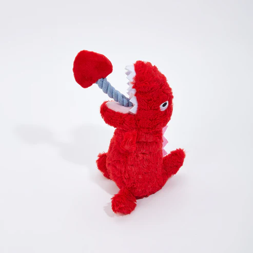 Este incrível dinossauro T-Rex é confeccionado em um material vermelho super macio e aconchegante, perfeito para abraços e mordidas. Mas ele guarda uma surpresa especial: de sua boca sai um coração vermelho, preso por uma resistente corda azul trançada, ideal para puxar e brincar de cabo de guerra. O interior da boca é forrado com um material rosa suave, criando um contraste encantador.