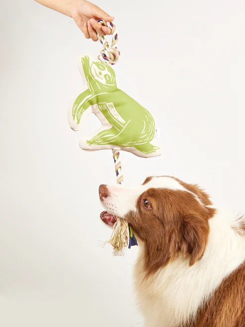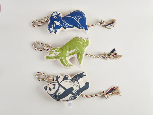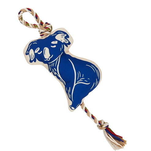 O design é único, moderno e vibrante, com um lindo koala em azul. A corda atravessa todo o brinquedo e sai na parte inferior com um nó na ponta, ideal para as partidas de cabo de guerra que os cães adoram.