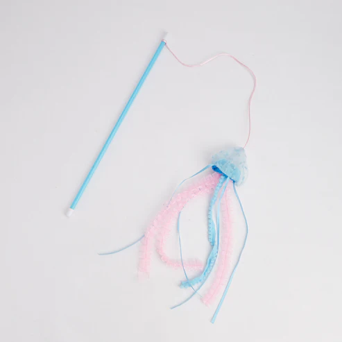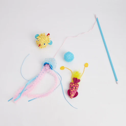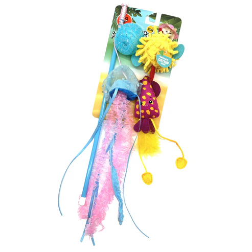 O kit inclui a varinha e cinco brinquedos extras para trocar, todos recheados com catnip.