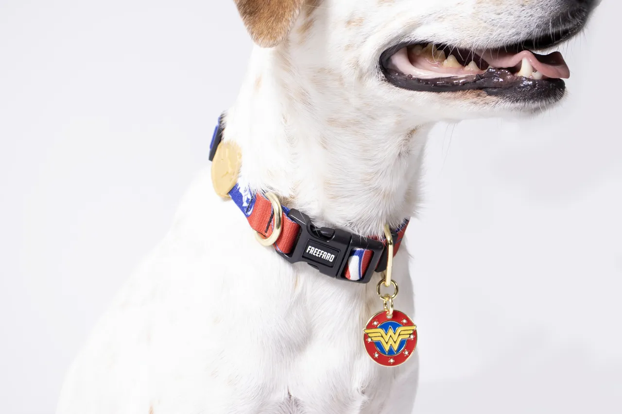 Uma das super-heroínas mais clássicas da DC Comics, é a Diana, a Princesa das Amazonas, Mulher Maravilha ao mundo dos homens. Conhecida por sua ferocidade em combate, mas também por ser compassiva e compreensiva. E assim, nossa inspiração para essa coleção surge, a Freefaro Mulher Maravilha. A coleção surge com o Tag Pinn Pet Mulher Maravilha, carregando o vermelho em seu tom principal com a narrativa de força e poder, agregando o azul e dourado também, e a logo master da super heroína.