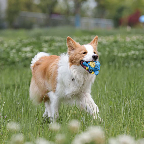 Dentro há uma bola TPR com pontas, que pode emitir sons nítidos. Os picos suaves massageiam a boca do seu cão para um segundo nível de diversão.