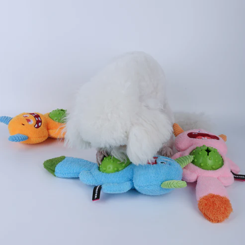 • Mix de materiais pra experiência top: Corpo de pelúcia macia e barriguinha de borracha natural, tudo ecológico. E o melhor? Dá pra esconder petiscos ali dentro, deixando a brincadeira ainda mais daora!