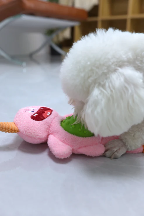 • Mix de materiais pra experiência top: Corpo de pelúcia macia e barriguinha de borracha natural, tudo ecológico. E o melhor? Dá pra esconder petiscos ali dentro, deixando a brincadeira ainda mais daora!