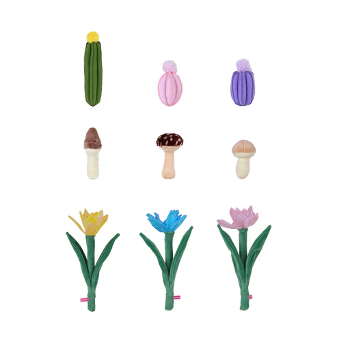 Ela vem com telhadinho, porta semiaberta, um tapetinho de grama, uma área de graminha, além de 6 cogumelos e cactos e 3 flores!